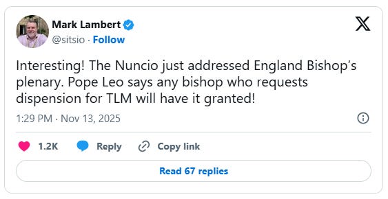 November 13, 2025 - The announcement that the Vatican, under Pope Leo XIV, will approve any and all requests for dispensation from article 3§2 of the Motu Proprio Traditionis Custodes, so that Mass according to the ‘Missale Romanum’ of 1962 may be celebrated.